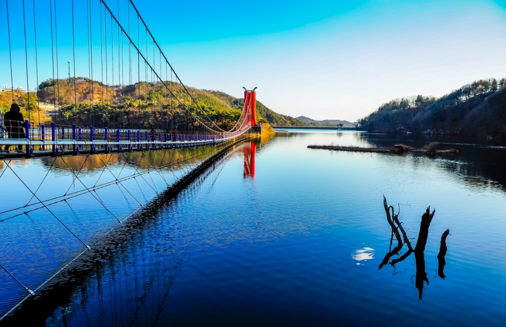 청양의 명물로 천장호 출렁다리가 있습니다. KBS 1박 2일 팀에서 방문하여 촬영되었던 곳으로 유명합니다. 우리나라에서 가장 긴 출렁다리이고 총 길이가 207미터 입니다. 다리 한가운데에는 청양의 특산물인 구기자와 고추 형태를 형상화한 조형물이 있습니다.